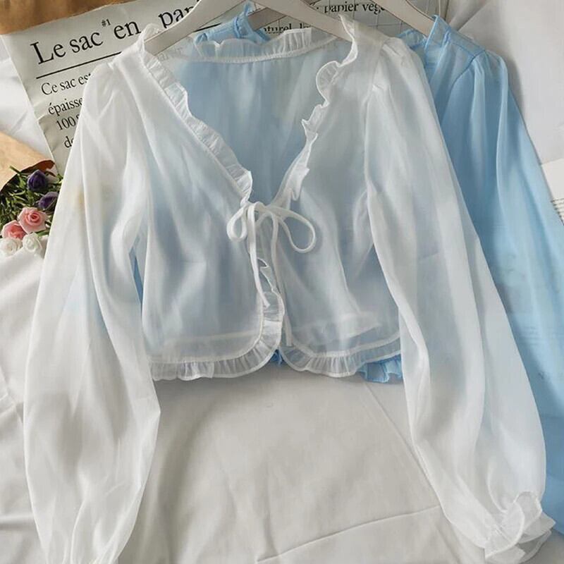 ゾンマー ゾンネン フェステ フラウエン ランガルム V-アウスシュニット durchsichtig Solide süß gekräuselte kurze Oberteile dünne los Krawatte Bluse weibliche Schul hemd ソリッドカラー | peak